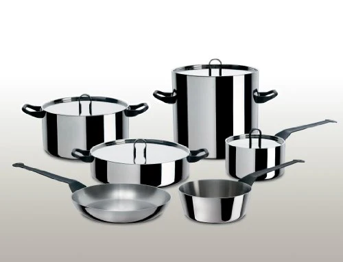 Dettagli: Il progetto “La Cintura di Orione”, disegnato da Richard Sapper, è stato dedicato al pubblico dei “privati gourmet”: cioè a quegli appassionati della cucina intelligente e creativa che la passione culinaria spesso porta al confine degli utensili professionali. Per questo la maggior parte dei recipienti è prodotta in una speciale bilamina (esterno in rame a alto spessore + interno in acciaio inossidabile 18/10) che ha caratteristiche professionali e consente di recuperare nella cucina i vantaggi del rame in termini di conduzione e omogenea distribuzione del calore, accoppiandoli alla grande igienicità dell’acciaio inossidabile nella parete interna.