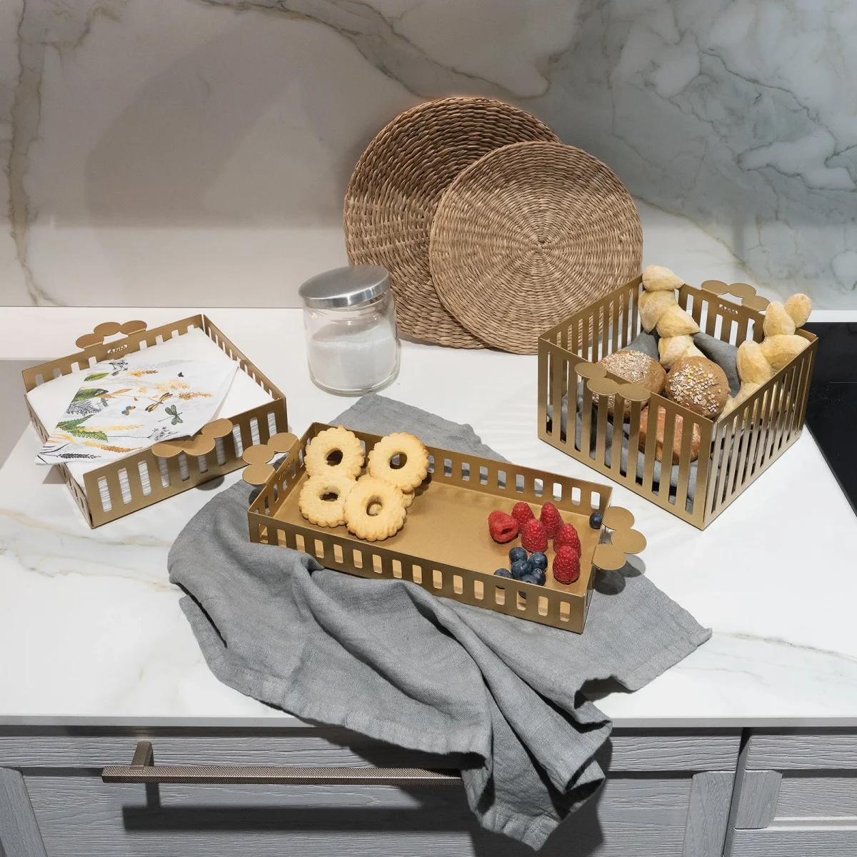 Il “Cestino pane Old”, rappresenta un’eccellente combinazione di funzionalità e design. Realizzato in ferro, con dimensioni di 28 x 20 x 12 cm, è disponibile in quattro affascinanti colorazioni: Giada, Oro laccato, Nero e Bianco marmo. Il suo stile moderno si distingue per le linee nette e geometriche del corpo principale, che creano un affascinante contrasto con le maniglie dalle forme più sinuose. Le maniglie, composte da tre cerchi, di cui uno leggermente spostato in avanti, conferiscono al cestino un aspetto unico e sofisticato.