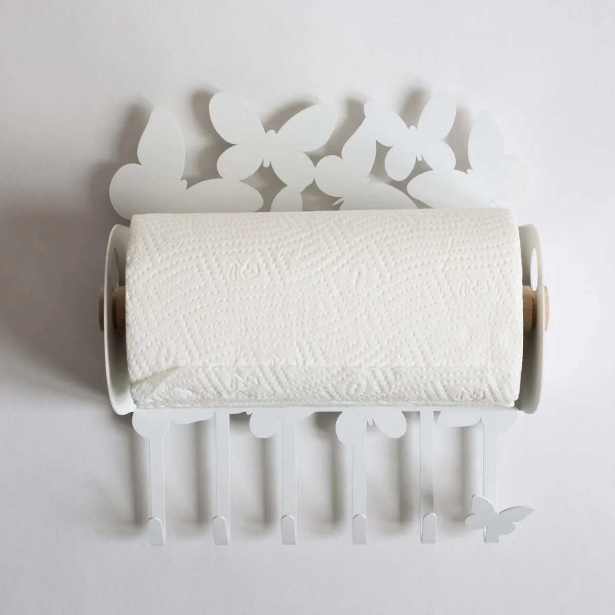 • Porta rotoli da appendere decorato con numerose farfalle nella parte superiore. Dotato anche di sei ganci.