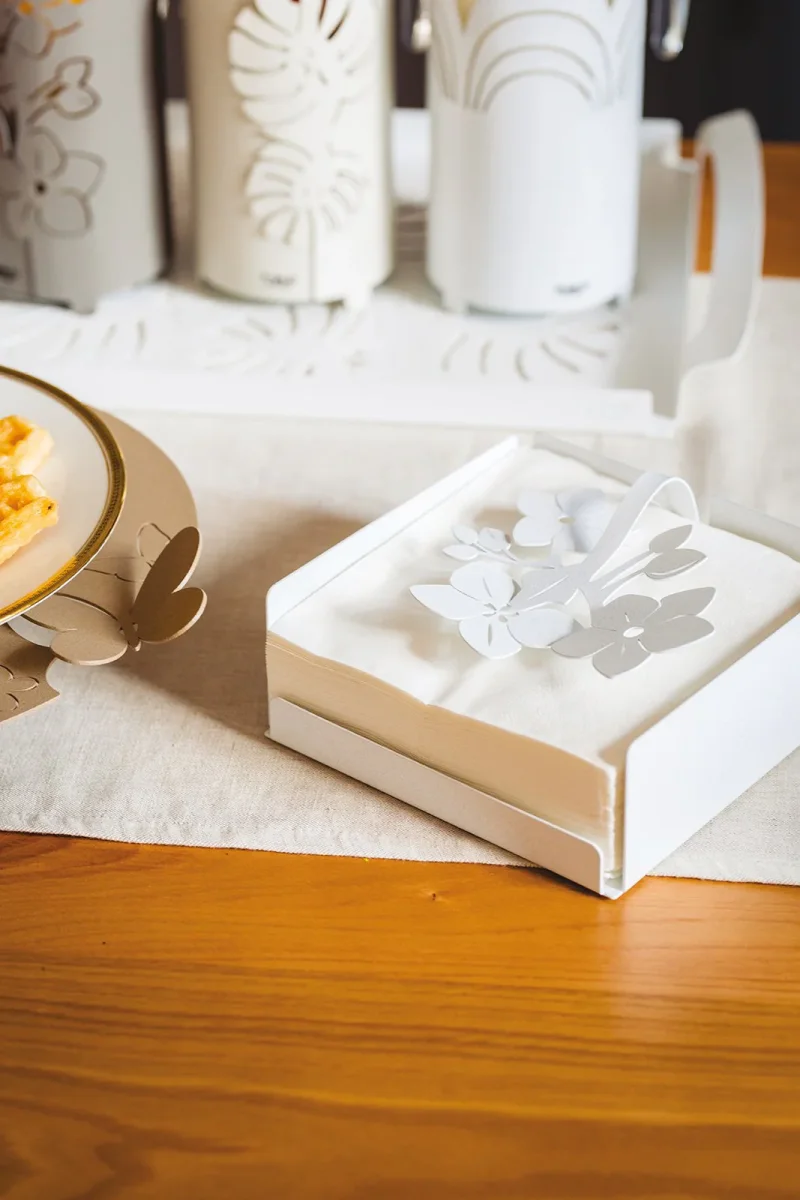 Ciò che distingue il Portatovaglioli Fior di Loto è il suo design distintivo, caratterizzato da quattro pareti laterali che definiscono il porta tovaglioli e un fermatovaglioli a forma di delicati fiori di loto. Questo elegante accorgimento non solo aggiunge un tocco di grazia e bellezza alla tua tavola, ma è anche progettato per mantenere saldamente i tovaglioli di formato 15×15 cm, garantendo ordine e precisione durante i pasti.