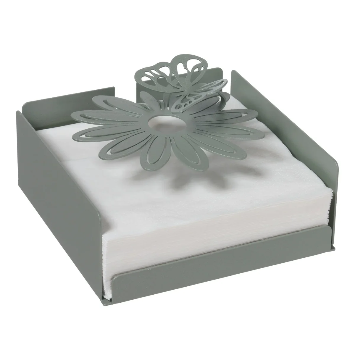 - Caratteristiche: Porta tovaglioli con fermatovaglioli a forma di margherite su cui si è posata una farfalla. Compatibile con i tovaglioli di formato 15×15 cm