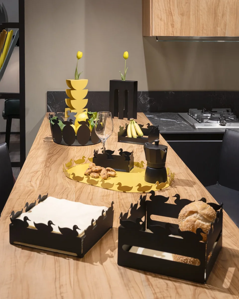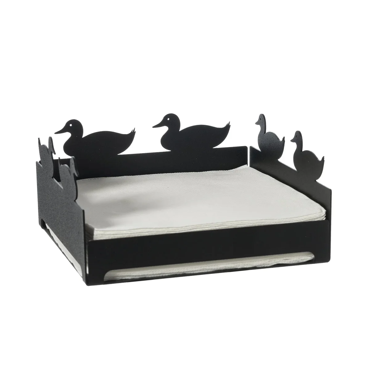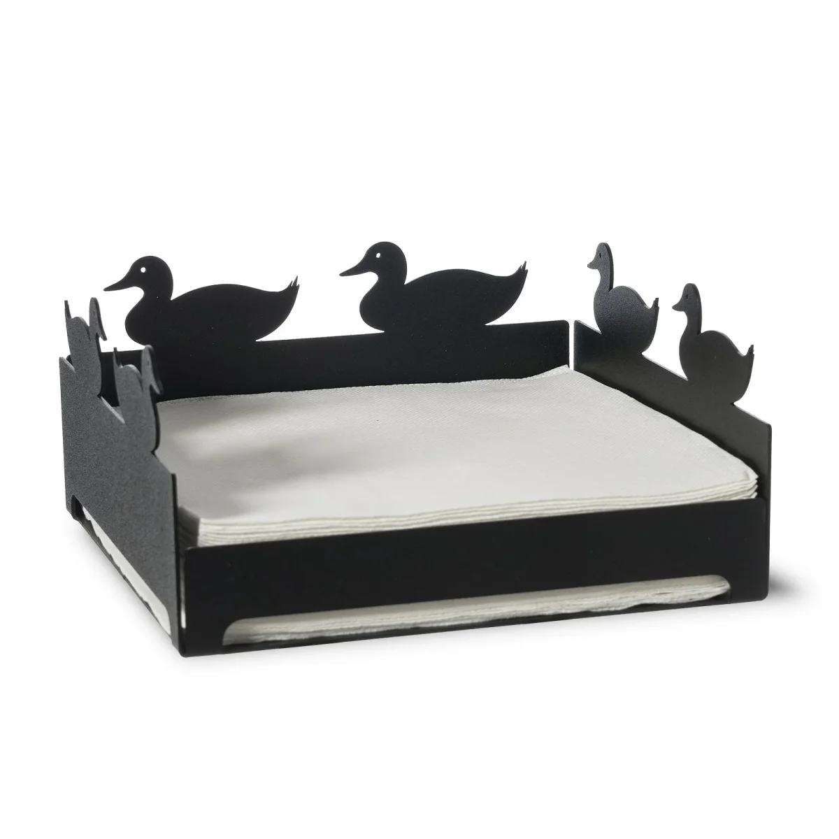- Caratteristiche: Il portatovaglioli moderno piccolo Duck presenta un design estremamente riconoscibile. Le sue paperelle, disposte in fila, sono il tratto distintivo di questa linea tavola che proprio da questo dettaglio ne prende il nome. Disponibile anche in una versione più grande.