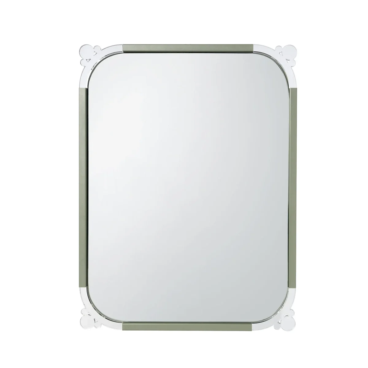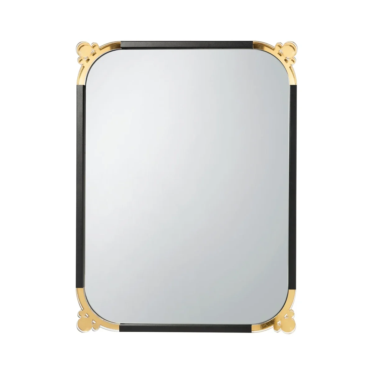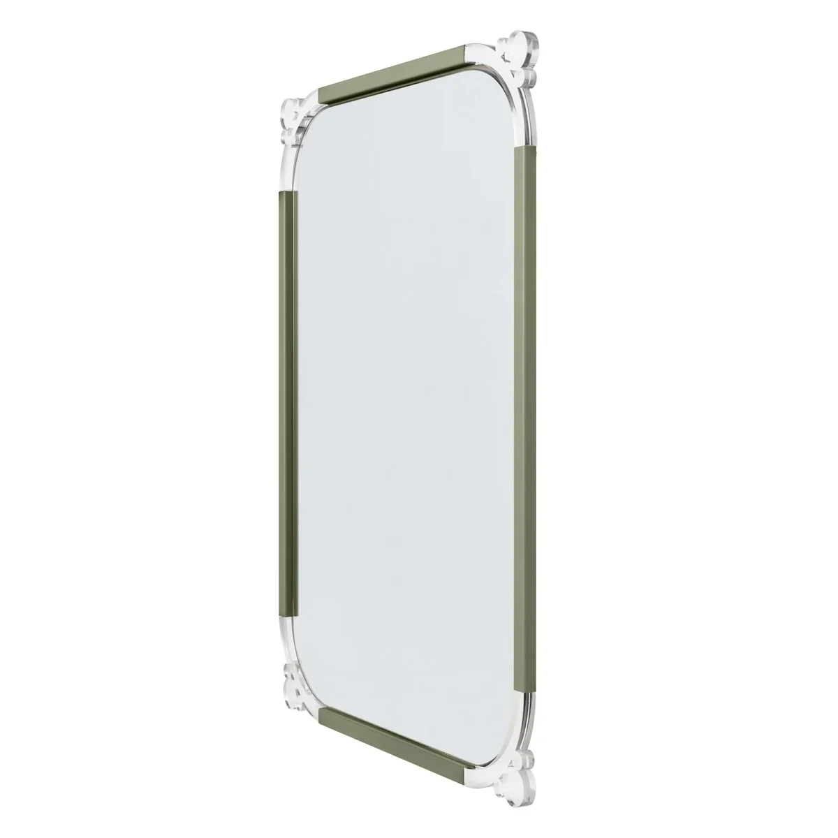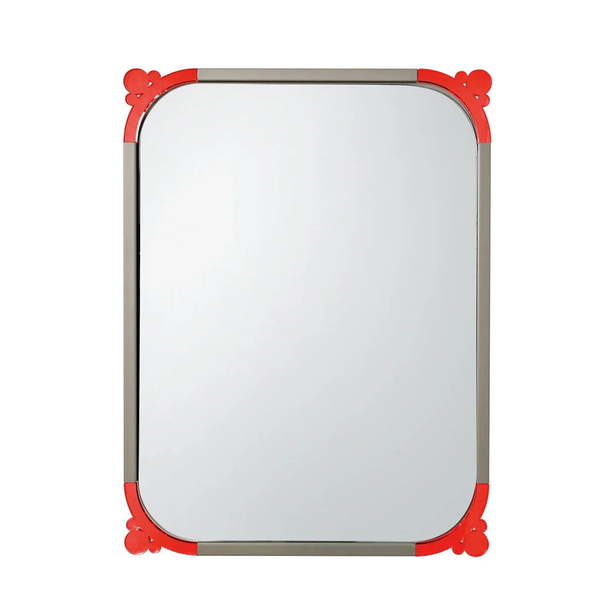 Lo specchio da parete particolare “Corner classic”, un raffinato elemento d’arredo realizzato in ferro dalle dimensioni di 60 x 80 cm di altezza, disponibile in tre eleganti combinazioni di colore: Giada/acrilico trasparente, Fango/acrilico rosso, e Nero/acrilico oro.