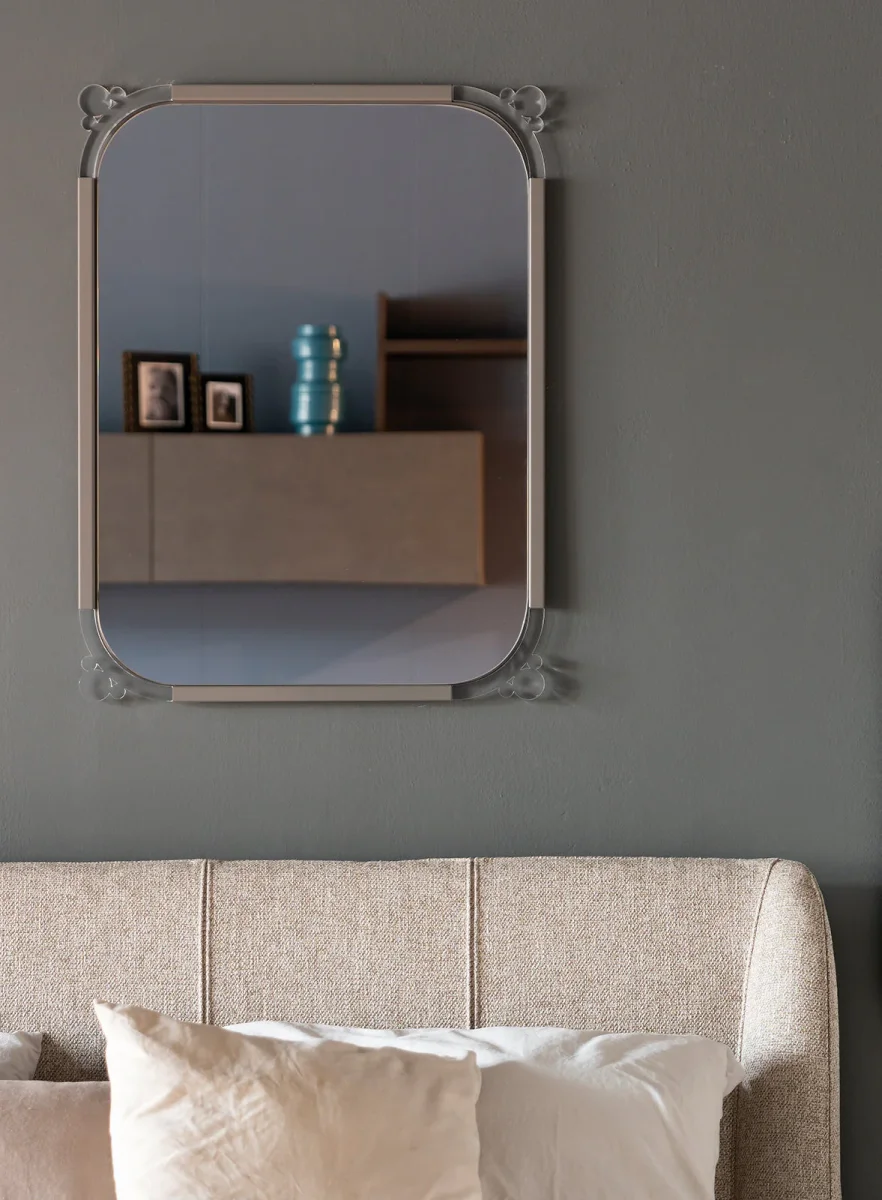Questo specchio si distingue per il suo design minimalista e la struttura stondata che conferisce un aspetto armonioso e contemporaneo. La cornice, semplice e pulita, è arricchita da un tocco di particolarità negli angoli, dove si trovano decorazioni in polimetilmetacrilato di diverso colore rispetto alla cornice. Questi decori sono formati da tre cerchi: uno centrale leggermente più grande e due più piccoli ai suoi lati, che aggiungono un elemento di interesse e originalità senza appesantire l’insieme. Il “Corner classic” è perfetto per chi desidera un pezzo d’arredo che sia al contempo semplice ed elegante, capace di arricchire con discrezione e stile qualsiasi ambiente, dalla zona living alla camera da letto e l’ingresso.