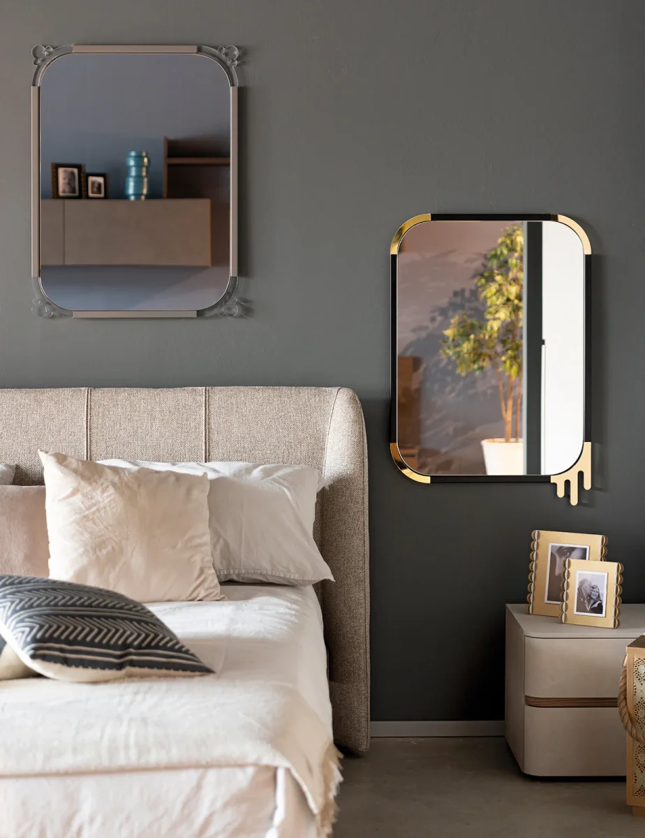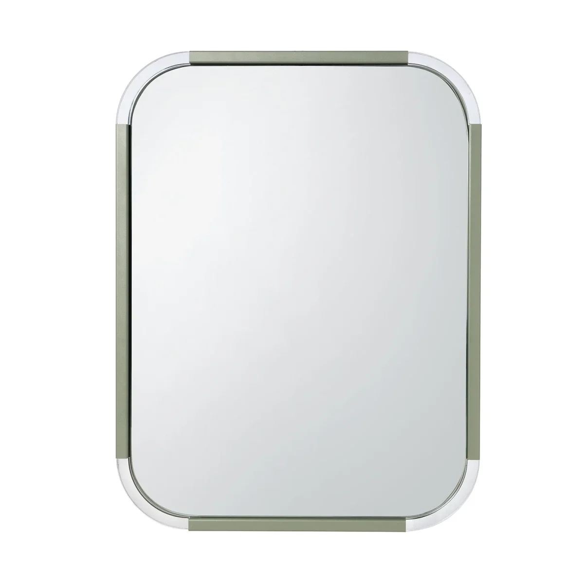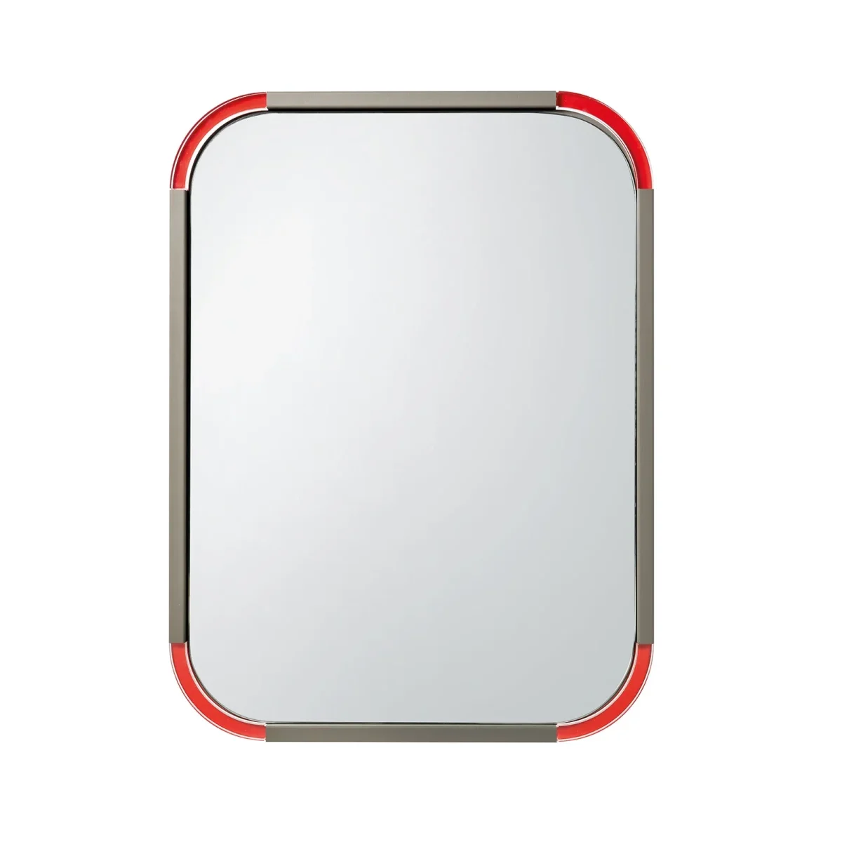 Lo specchio da parete particolare “Corner liscio”, è un elemento d’arredo raffinato realizzato in ferro dalle dimensioni di 60 x 80 cm di altezza. È disponibile in tre eleganti combinazioni di colore: Giada/acrilico trasparente, Fango/acrilico rosso, e Nero/acrilico oro. Questo specchio si distingue per il suo design estremamente minimalista. La struttura stondata e la cornice semplice e pulita donano un aspetto armonioso e contemporaneo. A differenza del “Corner Classic” o del “Corner Vernissage”, questo modello non dispone di decorazioni particolari sugli angoli, offrendo così una maggiore semplicità e compostezza. Tuttavia, gli angoli in polimetilmetacrilato sono decorati con colori diversi rispetto alla cornice, aggiungendo un tocco di particolarità senza compromettere la sobrietà del design.