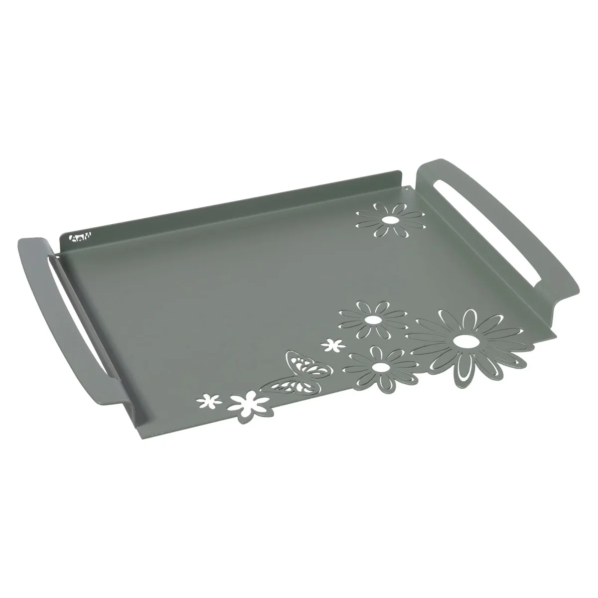 - Caratteristiche: Vassoio in ferro di forma rettangolare con manici, decorato in stile primaverile con margherite e farfalle