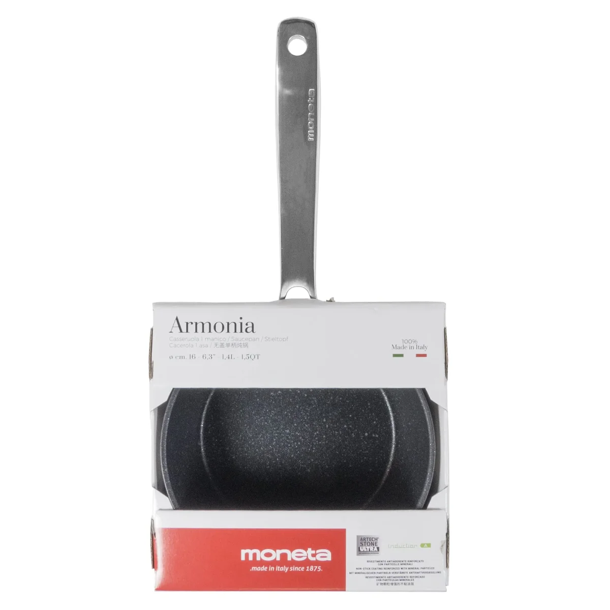 Dettagli: Moneta Armonia: corpo alto spessore per una eccezionale distribuzione del calore, con fondo a induzione che sviluppa una perfetta planarità e garantisce massima efficienza energetica. Per ogni tipo di piano cottura: induzione, gas, vetroceramica, piastra elettrica,…Rivestimento antiaderente effetto pietra Artech Stone Ultra, dalla superficie ruvida, per chi desidera uno strumento che non teme le maniere forti. Ideale per cotture veloci , uniformi e senza grassi, estremamente resistente ai graffi e alle abrasioni. Senza PFOA; senza BPA; senza Nickel e metalli pesanti. Manici e maniglie in acciaio inox microfuso dall’esclusivo design Moneta. Garanzia 5 anni. Made in Italy. Lavabile in lavastoviglie